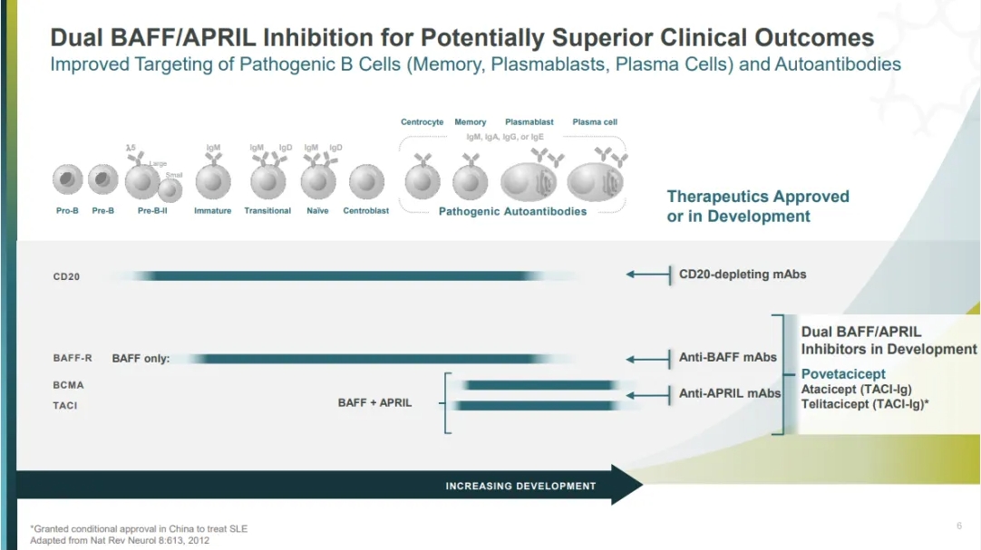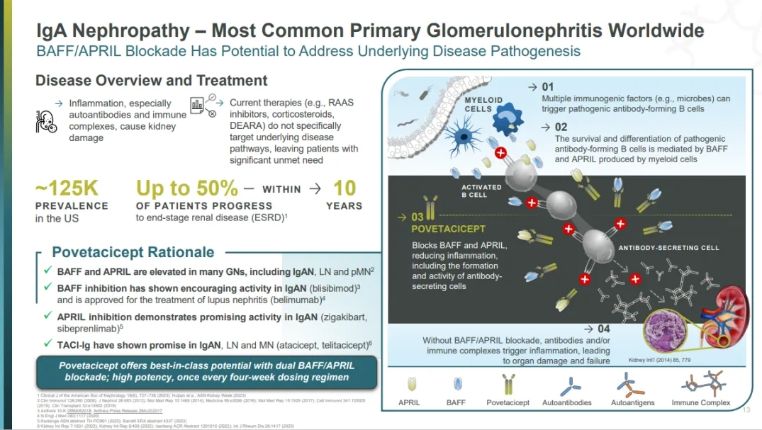 由于其作为BAFF/APRIL双拮抗剂的作用机制,Povetacicept有可能使其他严重自身免疫性肾病(如膜性肾病和狼疮肾炎)以及自身免疫性细胞减少症患者受益。有关肾脏适应症和自身免疫性细胞减少症的临床研究正在进行中。