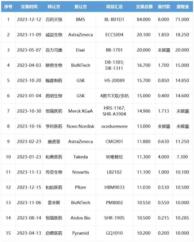 2023年中国创新药license out交易TOP15 图源:医药魔方
