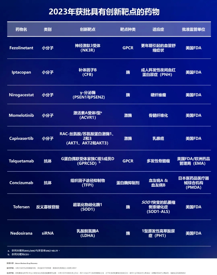 ▲2023年获批药物中,9款具有创新靶点的药物(图片来源:药明康德内容团队根据参考资料[1]制表)