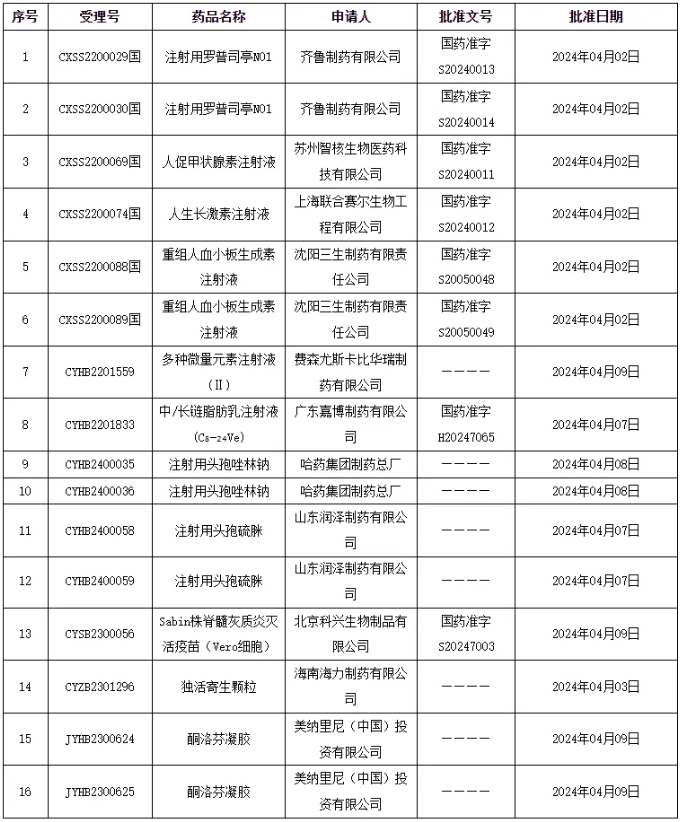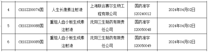 此外,还有上海联合赛尔生物工程有限公司的人生长激素注射液、沈阳三生制药有限责任公司的重组人血小板生成素注射液获批。