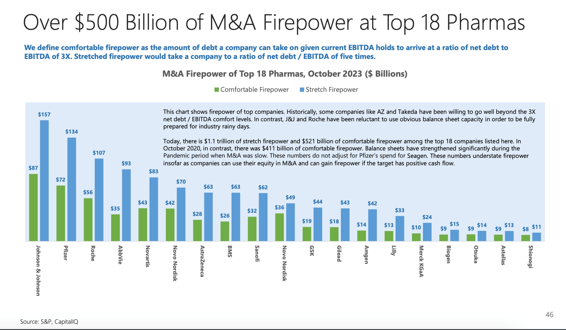 而且大药企们手里有钱。疫情期间的并购减少,让药企积累了现金。据投行Stifel分析,去年10月,排名前18的制药巨头们拥有至少5210亿美元的“火力”可用于交易,相比2020年10月的4110亿美元有显著增加。巨头们可以利用这一大笔钱寻找新药来替代他们未来几年内失去专利保护的产品。