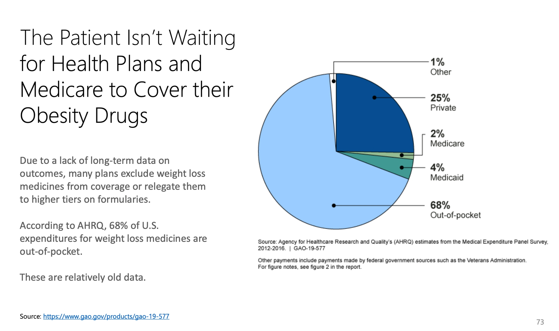 这类药物代表着巨大的市场机会,因为患者需要长期使用药物,且患者愿意自费购买药品。美国卫生保健研究与质量机构(AHRQ)之前的调研发现,在美国,68%的减肥药物支出是患者自负(见上图)。