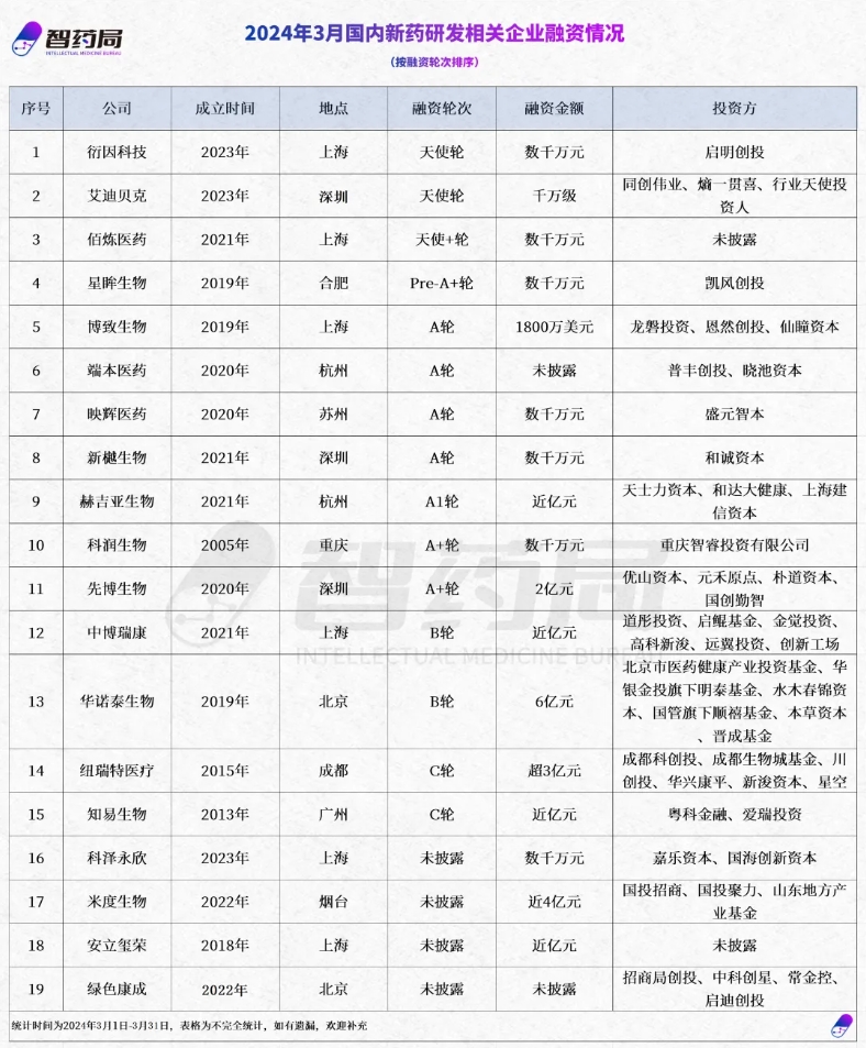 据智药局统计,2024年3月,国内共有19家涉及新药研发企业完成了新一轮融资,披露总金额约22.5亿人民币。