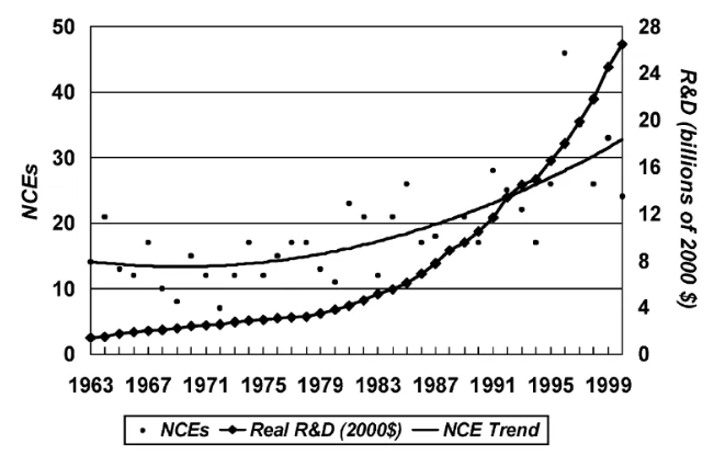 创新药价值得到了FDA的保护,因此众多药企开始投身于这一前沿创新领域,所带来的结果就是临床数量大幅增加,美国I期临床试验的药物数量从1990年的386种增加到2000年的1512种。临床数量的全面提升导致两个结果,第一药企研发投入大幅增加;第二上市药品的数量持续增长。