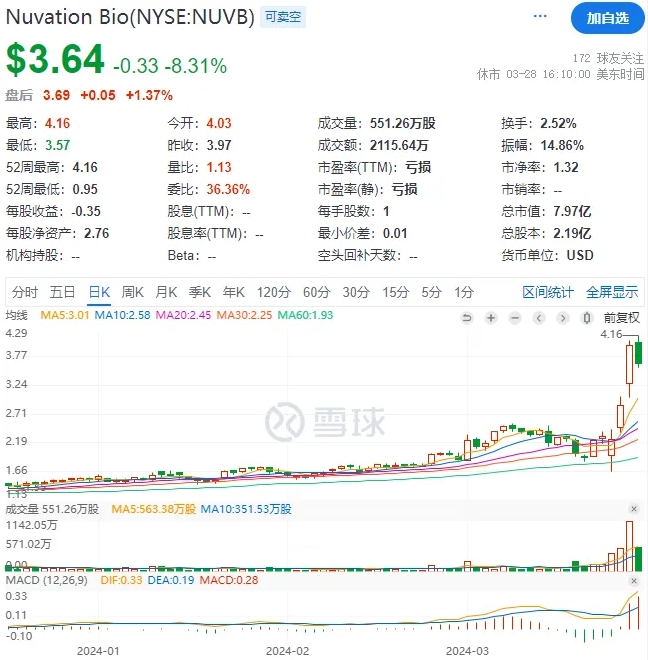 受此影响,Nuvation Bio的股价连续两天暴涨76.44%,市值增加了近4亿美元。