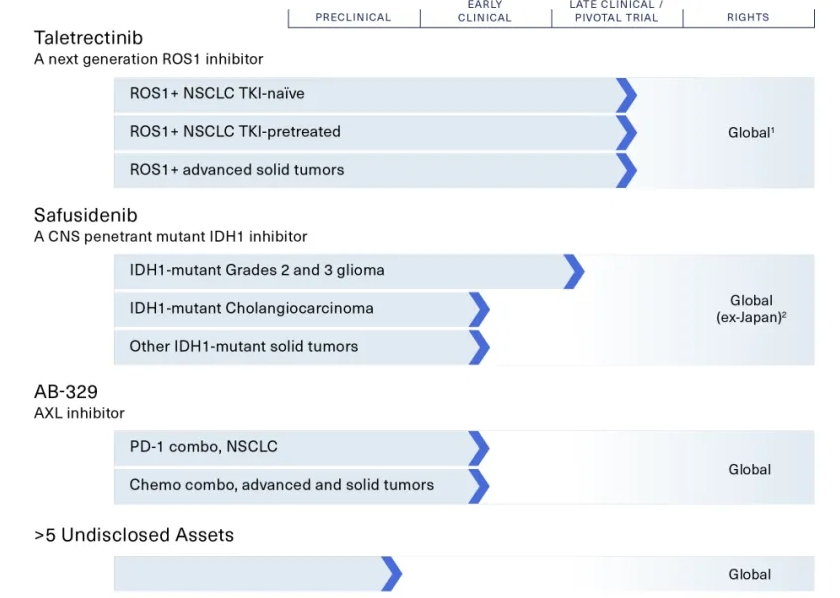 AB—329:一款AXL抑制剂,可用于与检查点抑制剂或化疗联合使用治疗非小细胞肺癌或其他实体肿瘤,目前处于临床前研究阶段。