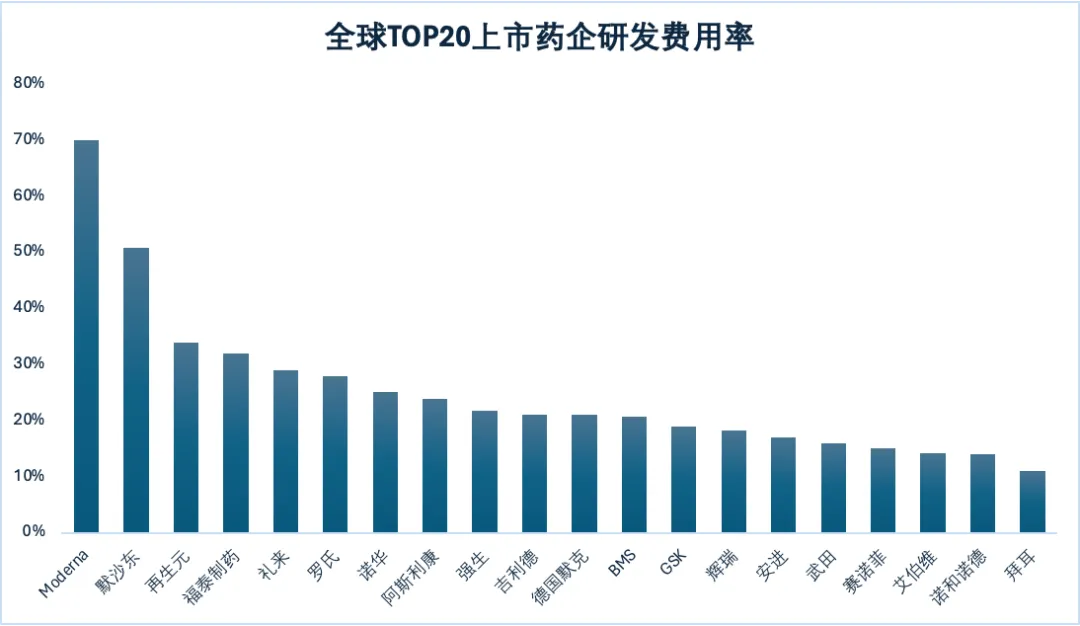 20家跨国药企中,除了Moderna之外,拥有高研发费用率的企业与往年没什么不同,又早已大不相同。