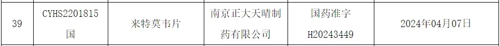 4月15日,国家药品监督管理局官网显示,南京正大天晴制药按仿制4类报产的来特莫韦片获批上市,视同通过一致性评价。该产品为国内首仿。