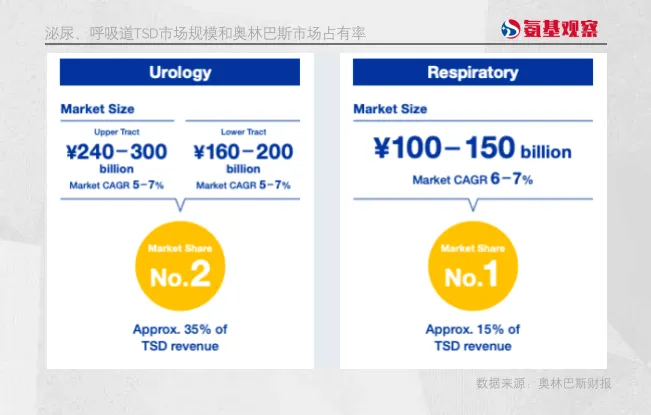 另外,在泌尿科、呼吸道领域,TSD市场规模同样可观。在泌尿科,2023年3月末总市场规模大约是4000亿日元-5000亿日元,折合人民币187亿元-234亿元之间;在呼吸道领域,TSD市场规模大约为1000亿日元-1500亿日元,折合46亿-70亿人民币之间。