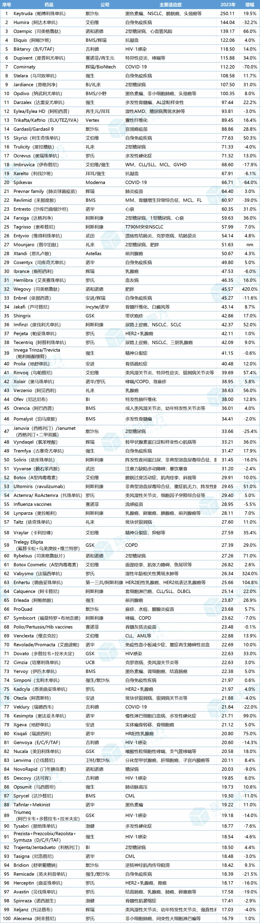 此外,入围TOP100榜单的药物类型总体变化也不大,小分子类药物共计45款,单抗类31款,两大类别实现的销售总额分别为1758.71亿美元、1654.5亿美元。2