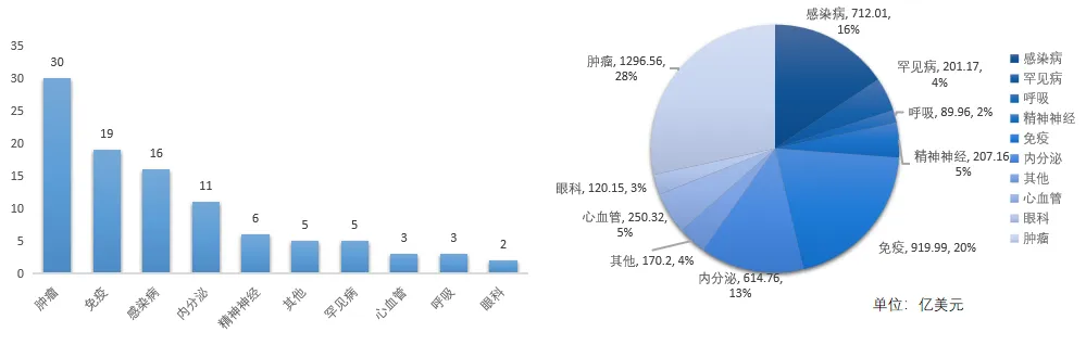 相较去年,2023年畅销药TOP100名单发生巨大变化。首先,新冠类产品大幅退出,这主要是因为疫情解除后疫苗以及治疗药物的需求急速萎缩,对TOP100上榜门槛以及总体数量都有不同程度的影响。其次,诸多老产品收入下滑严重,前“药王”修美乐在专利断崖的冲击下销售额大幅跳水,并由K药接任新“药王”,同时包括来那度胺、依那西普、伊布替尼等在内的多款重磅产品也在专利到期后受到仿制药/生物类似药侵蚀中持续下降。第三,新产品快速崛起,包括司美格鲁肽、替尔泊肽这类GLP-1公众明星产品,以及度普利尤单抗、利生奇珠单抗等新生代专科药物销售收入飙升。此外,2023年的畅销药榜单还有一大亮点,有10款药物实现了100亿+美元销售额,这是历史上 “超级重磅炸弹”药物最多的一个年份(见:100亿+美元超级重磅炸弹药物,为什么越来越多了?)。从TOP100药物的疾病领域分布看,除了感染病类药品数量和销售总额在2023年有大幅减少,其余领域包括肿瘤、免疫、内分泌、心血管等疾病领域都有所增涨。其中,肿瘤、免疫市场规模仍然最大,分别以28%、20%的比重达成了约1296亿美元和920亿美元市场份额。