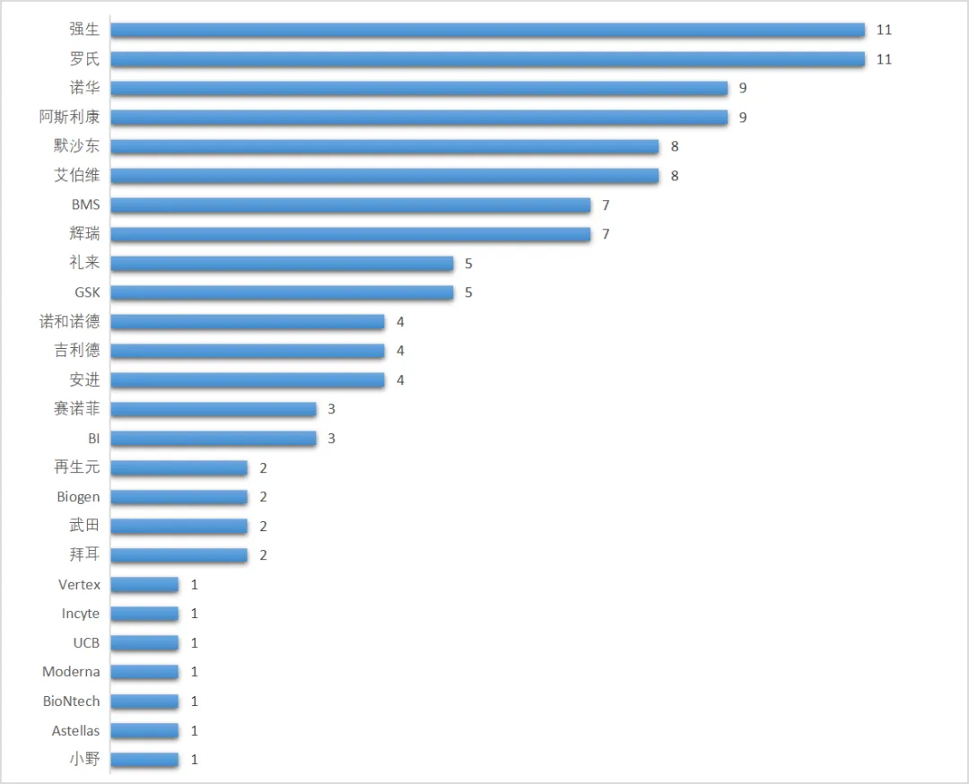 从企业维度来看,TOP100药品的企业分布较以往也无太多变化,只不过各家的数量有着细微变动。其中,强生以11款药品居于首位,与2022年相同,目前有一半产品收入处于下滑状态,但其核心驱动因子乌司奴单抗、古赛奇尤单抗以及达雷妥尤单抗、阿帕他胺销售收入仍保持稳定的增长趋势。