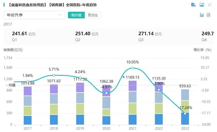罗普司亭由安进原研,作为第二代TPO-R激动剂类药物,自2008年8月在美国率先上市后,经过EMA等机构的严格审批,迅速在全球范围内得到应用。注射用罗普司亭N01作为首个国产长效升血小板药物,其临床优势尤为突出。它不仅能迅速发挥药效,早期应答率高,而且给药频率极低,仅需每周一次,极大降低了患者的用药负担。据药融云数据统计,在全国院内市场血液和造血系统用药销售峰值超千亿元,2022年全国院内市场销售额达1135.3亿元。