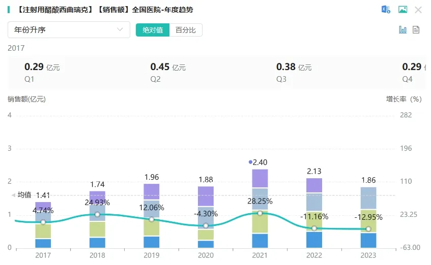 注射用醋酸西曲瑞克原研来自默克雪兰诺公司。是第三代促性腺激素释放激素拮抗剂(GnRH-A)药物,适用于防止在控制性卵巢刺激下女性的提前排卵,便于之后的采卵和辅助生殖技术治疗。据药融云数据显示,注射用醋酸西曲瑞克在2022年全国院内市场销售额超2亿元。