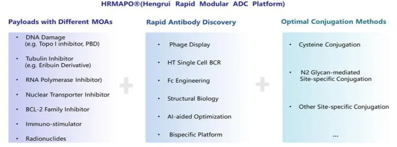 每月1款创新药拿下快速通道资格认定的背后,是恒瑞模块化ADC创新平台HRMAP十年的厚积薄发:该平台能够快速合成各类ADC分子进行筛选,包含多种靶向抗体、多种机制的毒素、多种连接子和定点连接技术。