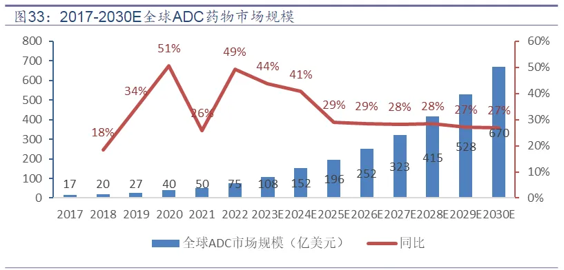 图3 2017-2030E全球ADC药物市场规模 图片来源:太平洋证券