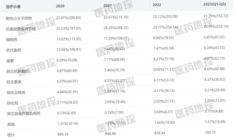 2020-2023抗肿瘤药的热门治疗小类 来源:PDB药物综合数据库,国内院端放大