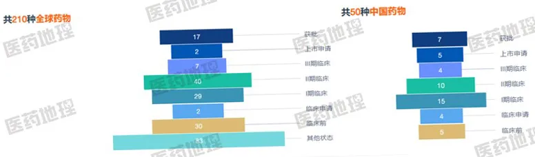 据Pharma ONE智能药物大数据分析平台统计,全球目前总共有210种药物在进行CD20靶点相关的研究,中国是50种相关药物。其中,在中国获批上市的药物中,有两款属于国产自研的新药。