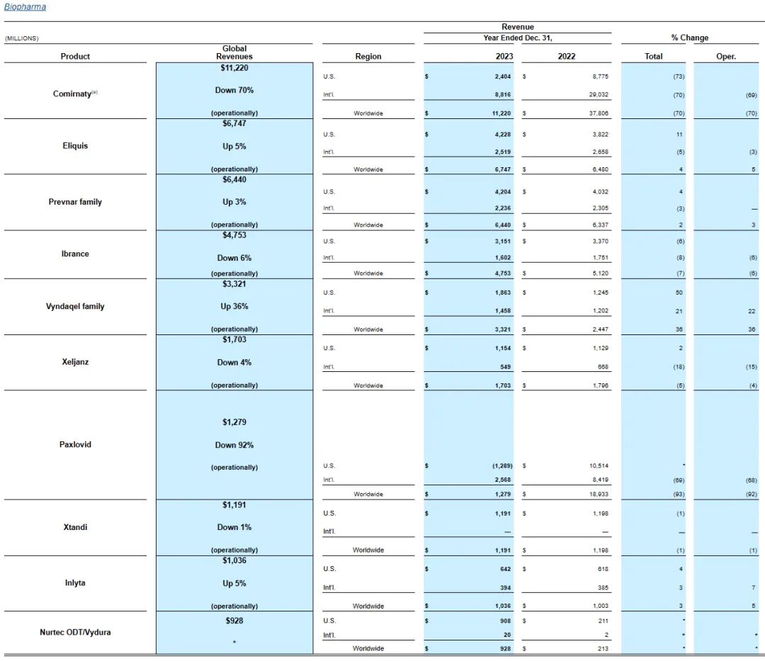 而辉瑞增长的药物几乎都与肿瘤无关,包括心肌病药物维达全(氯苯唑酸),销售额同比增长 36%;抗凝剂艾乐妥(阿哌沙班)同比增长 5%;获批上市的呼吸道合胞病毒(RSV)疫苗 Abrysvo 和 2022 年收购的偏头痛药物瑞美吉泮(Rimegepant,商品名 NURTEC™ODT),以及镰状细胞病药物伏塞洛托(Voxelotor)。