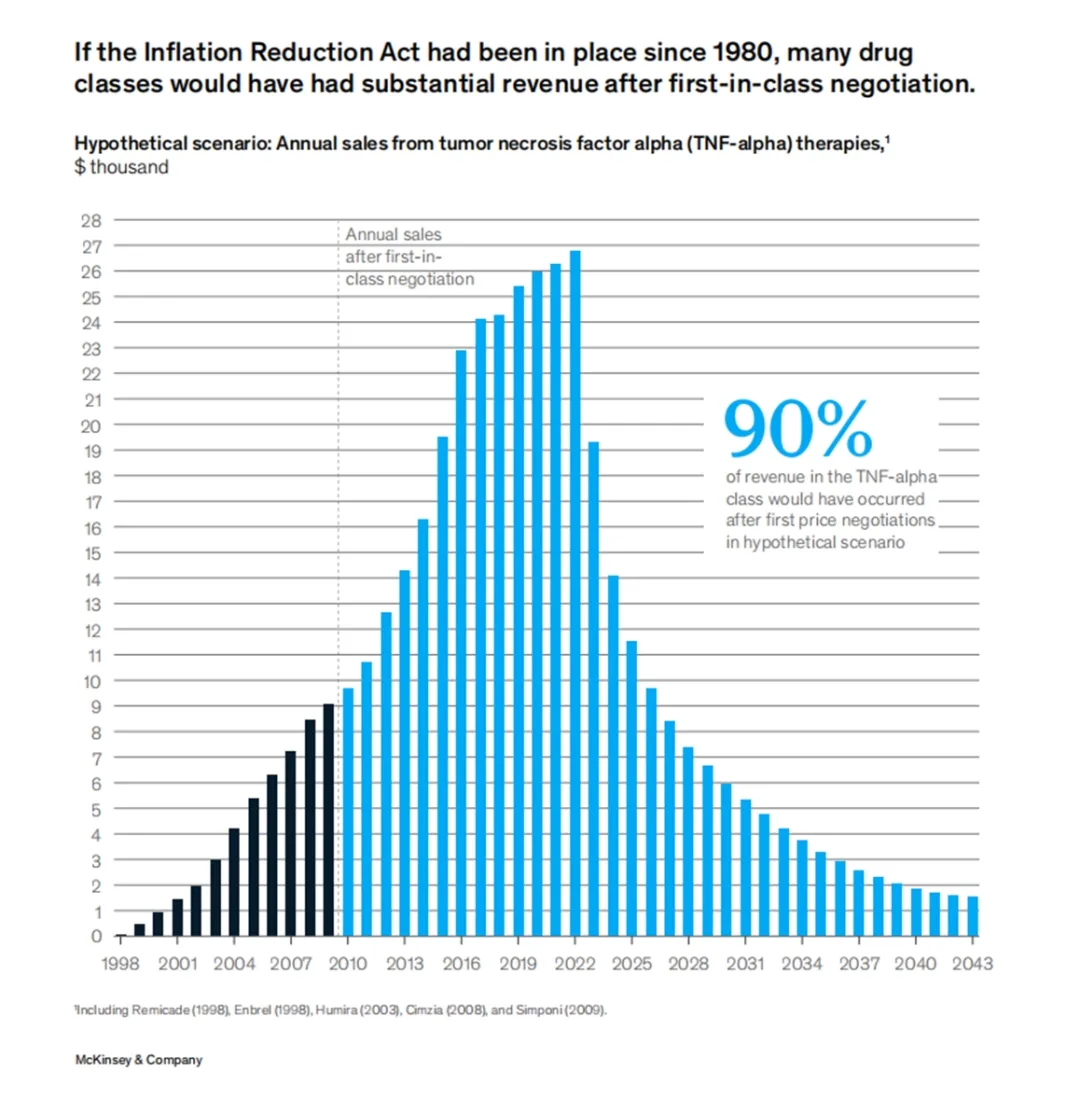2022年颁布的美国《通胀削减法案》(IRA),也将大大加剧药品生命周期的压缩。麦肯锡创建了一个假设情景,将《通胀削减法案》设定在1980年,以此来分析它的潜在影响。