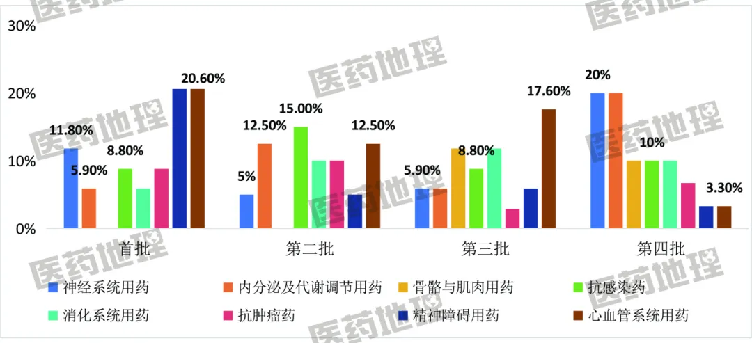 四批《清单》纳入的药品大多来自国外已上市但国内尚未上市的药品,或者国内已上市但缺乏对应的剂型或者规格的药品。这些药品涉及的治疗领域主要集中在心血管系统用药、抗感染药、内分泌及代谢调节用药以及神经系统用药领域。《清单》药品的治疗领域分布较为集中,这为企业在儿童用药深入研究提供有利条件。详细情况如下图1。