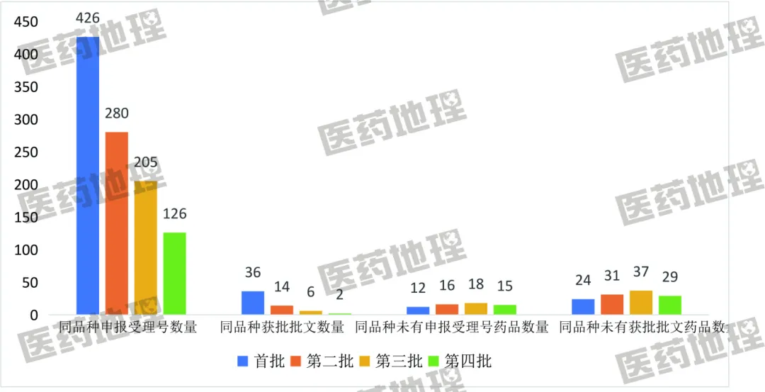 《清单》中的药品研发有优先审评的加速通道,通过统计《清单》药品的CDE申报数量和药品上市获批数量,来反应儿童用药的研发情况。统计时间截至2024年3月底,四批《清单》同品种获批批文有58个,同品种申报受理号有1037个。尚未有一个受理号的品种有61个,占所有品种的44%;尚未有一个批文获批的品种有108个,占所有品种的78%。虽然当前四批《清单》中有多种药品尚未获批上市,但大多数已经在CDE提交申报了,考虑到药品从申报到上市需要一定的时间,预计未来会有越来越多的药品获批上市。各批次具体数据情况如下图2。