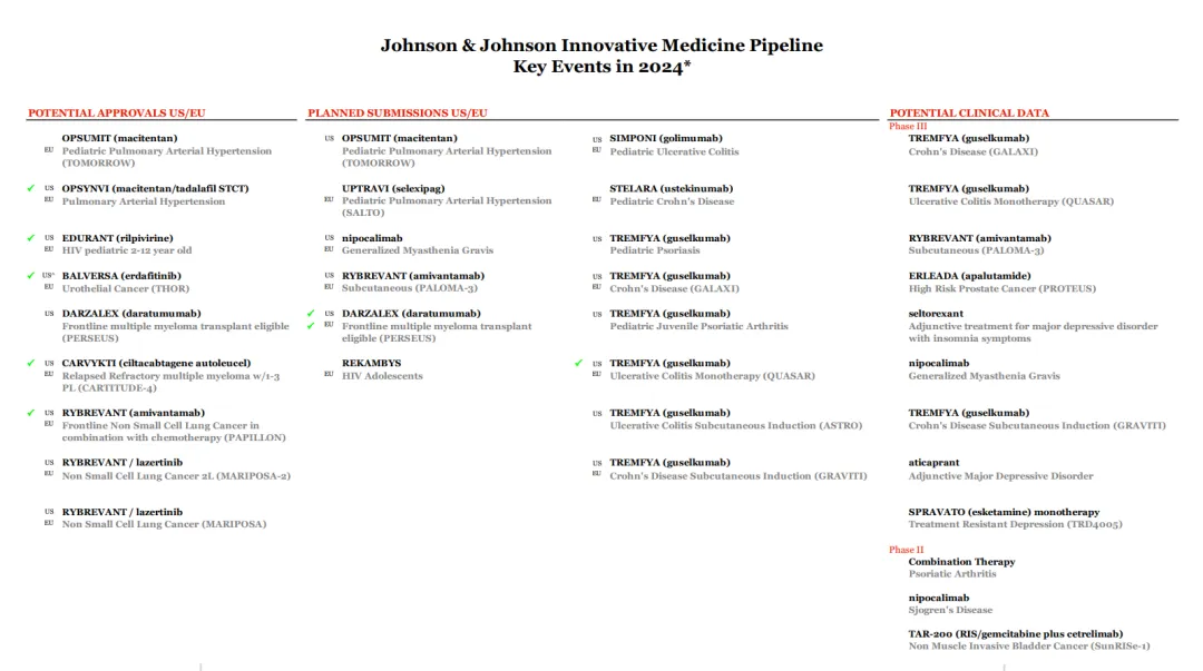 值得注意的是,对比强生2023年12月时的管线,在刚更新的管线中,两个肿瘤的I期项目JNJ-8114 (PSMA/CD3)、JNJ-4916溶瘤病毒已不再见。