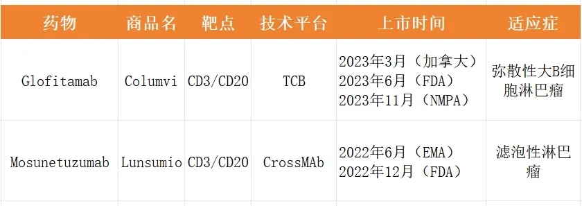 罗氏是第一个将CD20/CD3双抗药物推向市场的公司。2022年6月,罗氏的第一款CD20/CD3双抗Mosunetuzumab(商品名Lunsumio)获得了欧盟委员会有条件上市批准(3线+复发性/难治性滤泡性淋巴瘤),成为全球首个获批上市CD20/CD3双抗。之后,Genmab/艾伯维的Epcoritamab、罗氏的第二款CD20/CD3双抗Glofitamab陆续获得批准上市。