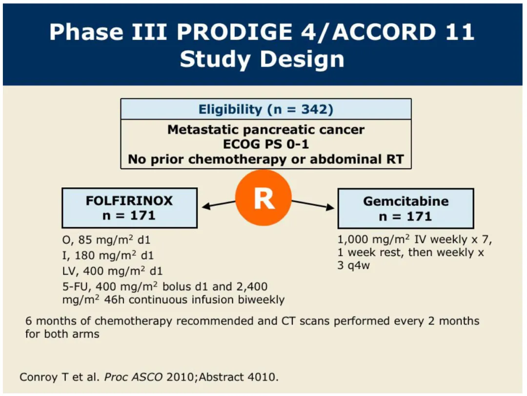 2011年,一项针对晚期胰腺癌患者的改良FOLFIRINOX(亚叶酸钙、氟尿嘧啶、伊立替康和奥沙利铂) vs 吉西他滨的试验结果(注:PRODIGE研究)显示,主要终点OS有4个月的改善以及QOL的改善,并成为耐受该方案患者的标准治疗。尽管存在明显副作用的风险(如:发热性中性粒细胞减少症、血小板减少症、神经病变和腹泻),但与接受吉西他滨的患者相比,接受改良FOLFIRINOX的患者总体QOL恶化的比例较小,OS的提高是向前迈出的重要一步。