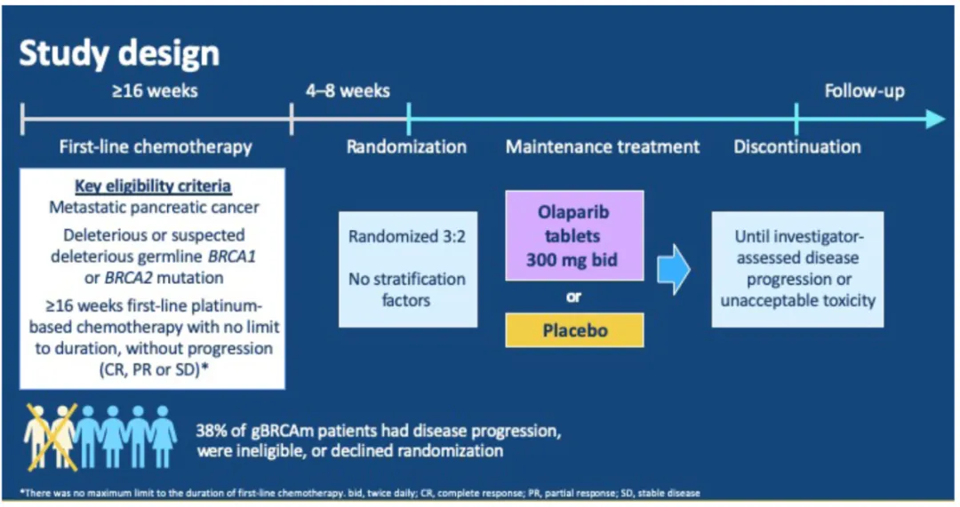 最有争议的胰腺癌试验之一,是2019年发表的POLO试验,该试验存在几个问题:首先,该试验纳入了对化疗有应答的患者,在化疗后4个月随机分配接受奥拉帕利或安慰剂维持治疗。在我们看来,这项治疗分配是不道德的。在临床实践中,对于已确认缓解的患者,没有理由停止化疗,对照组应继续接受化疗,给他们提供安慰剂是不可接受的。