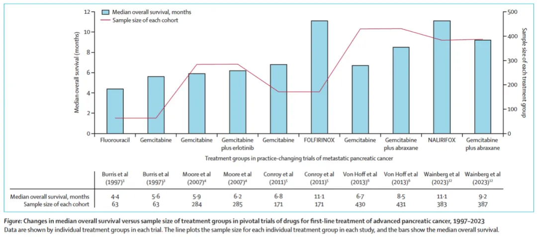胰腺癌是现代肿瘤学面临的几个挑战之一。1997年,发表了第一个建立晚期胰腺癌治疗标准的随机对照试验,显示吉西他滨优于氟尿嘧啶,改善了患者的生活质量(QOL),改善了疼痛控制,体重增加,还将中位总生存期(OS)提高了1个月,研究人员承认这是一个“适度”(modest)的优势。吉西他滨获得FDA批准用于晚期胰腺癌的治疗,主要是基于QOL的改善。1997年,我们的肿瘤学前辈当然不认为4周的中位OS改善是一个突破。