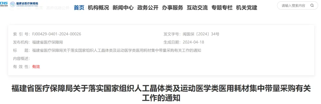 4月19日,福建医保局发布《关于落实国家组织人工晶体类及运动医学类医用耗材集中带量采购有关工作的通知》,明确将在4月30日起执行人工晶体、运动医学国采品种的中选结果。