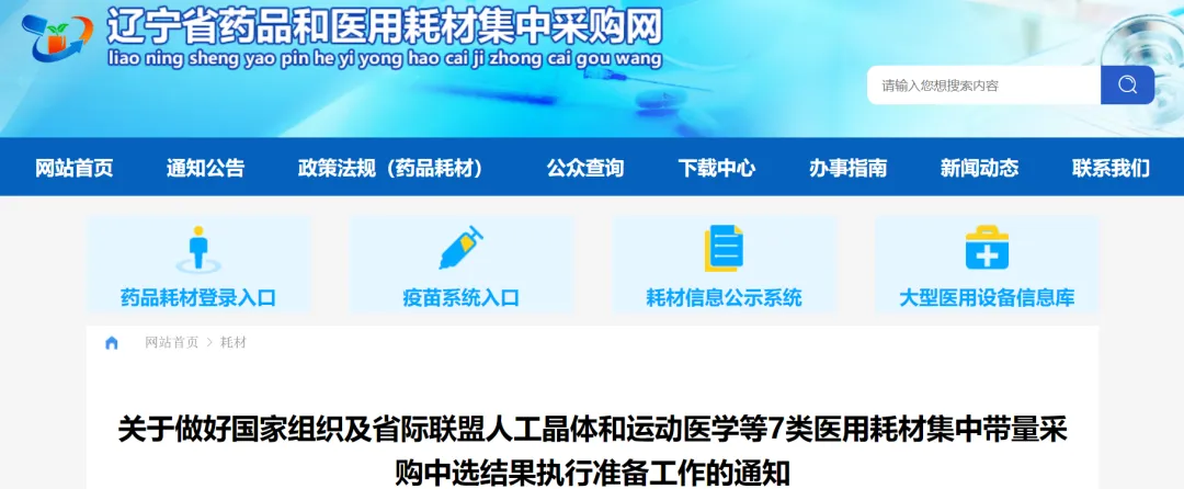 同日,辽宁省药品及医用耗材集中采购网发布《关于做好国家组织及省际联盟人工晶体和运动医学等7类医用耗材集中带量采购中选结果执行准备工作的通知》。