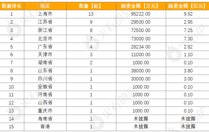 从融资地域看,本月融资项目主要分布在上海市(11起)和江苏省(9起)。从融资金额来看,上海市最为突出,融资金额高达9.52亿元;其次,北京市也较为突出,融资金额高达7.30亿元。表3:3月融资事件区域分布情况