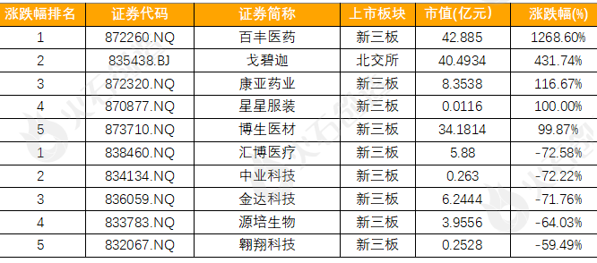 同上月相比,百丰医药、戈碧迦、康亚药业、星星服装、博生医材的涨幅较大,其中百丰医药(872260)市值涨幅高达1268.60%,戈碧迦(835438)市值涨幅达431.74%,康亚药业(872320)市值涨幅达116.67%;汇博医疗、中业科技、金达科技、源培生物、翱翔科技的跌幅较大,其中汇博医疗(838460)市值跌幅达72.58%,中业科技(834134)市值跌幅达72.22%,金达科技(836059)市值跌幅达71.76%。表6:3月涨跌幅前五的生物医药企业