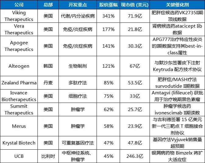 2024年第一季度,美股中型市值生物科技和制药公司哪家表现最佳?答案是Viking Therapeutics,其股价涨幅341%,现市值为71.9亿美元。