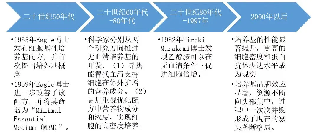 细胞培养基的分类方式众多,根据组成成分不同可以分为含血清培养基、低血清培养基、无血清培养基、无蛋白培养基等。这一行业从二十世纪50年代发展至今,共经历了四大时期,由血清培养基逐渐转向无血清培养基,并进一步开发出了化学成分限定培养基,在21世纪以后,无动物源的化学成分限定的培养基持续优化,品牌效应出现,同时,更大规模的生产需求也对培养基提出了更高的要求。