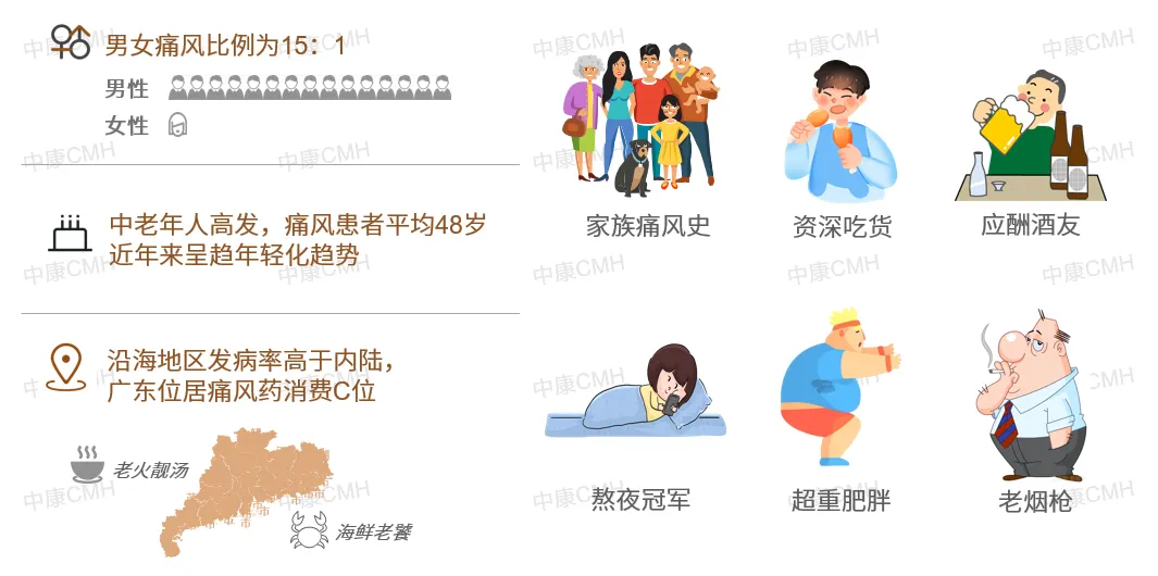 现代生活习惯和饮食结构变化,导致高尿酸血症和痛风疾病患者人数不断攀升,痛风发作时的剧烈疼痛,严重影响患者生活质量。若除去遗传因素,偏好高嘌呤食物、饮酒的中年男人;热衷熬夜、美食、肥胖的年轻人;喜爱老火靓汤、海鲜的广东人,正成为痛风发作的主力人群。