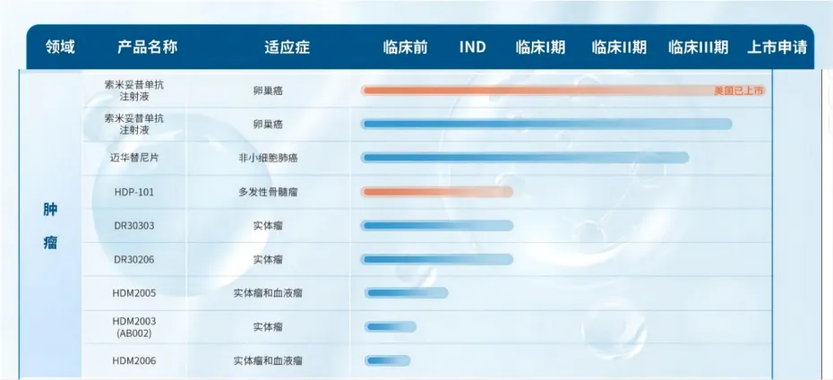 从美国ImmunoGen引进的全球首创ADC新药索米妥昔单抗注射液(ELAHERE,研发代码:IMGN853、HDM2002)的中国上市许可申请于2023年10月获得受理,适应症为治疗既往接受过1-3线系统性治疗的叶酸受体α(FRα)阳性的铂类耐药的上皮性卵巢癌、输卵管癌或原发性腹膜癌成年患者。
