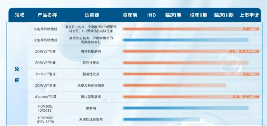 2023年引入的一系列皮肤疾病适应症的外用制剂,包括从美国Arcutis引进的治疗斑块状银屑病、特应性皮炎、脂溢性皮炎和头皮及身体银屑病Zoryve(罗氟司特乳膏剂和罗氟司特泡沫剂);从MC2引进的治疗斑块状银屑病Wynzora乳膏,相关的临床注册工作都在积极推进中。