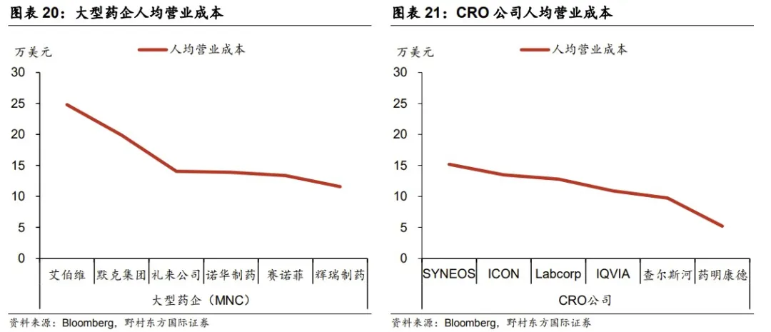 而野村东方国际证券的一则报告也显示,来自中国CRO公司的人均营业成本要远比美国头部CRO服务商要低得多。