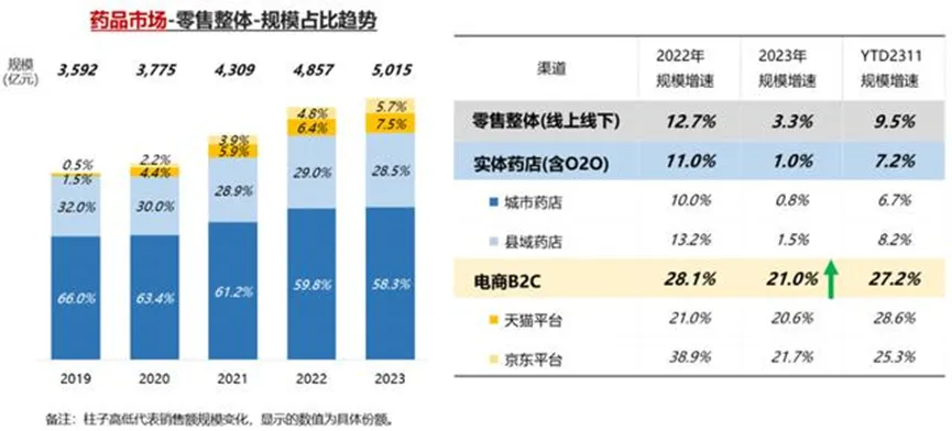 据中康CMH数据,2023年中国医药零售市场的药品销售规模达到5,015亿元,同比增长3.3%,其中实体药店(含O2O)2023年药品规模同比小幅增长1.0%,电商B2C增速达21.0%,远高于实体药店(含O2O)增速,渠道占比提升1.9%,渠道重要性进一步凸显。