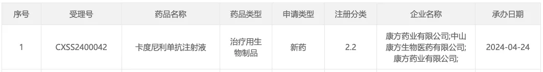 4 月 24 日,据 CDE 官网显示,康方自主研发的 PD-1/CTLA-4 双抗卡度尼利单抗新适应症上市申请获受理。