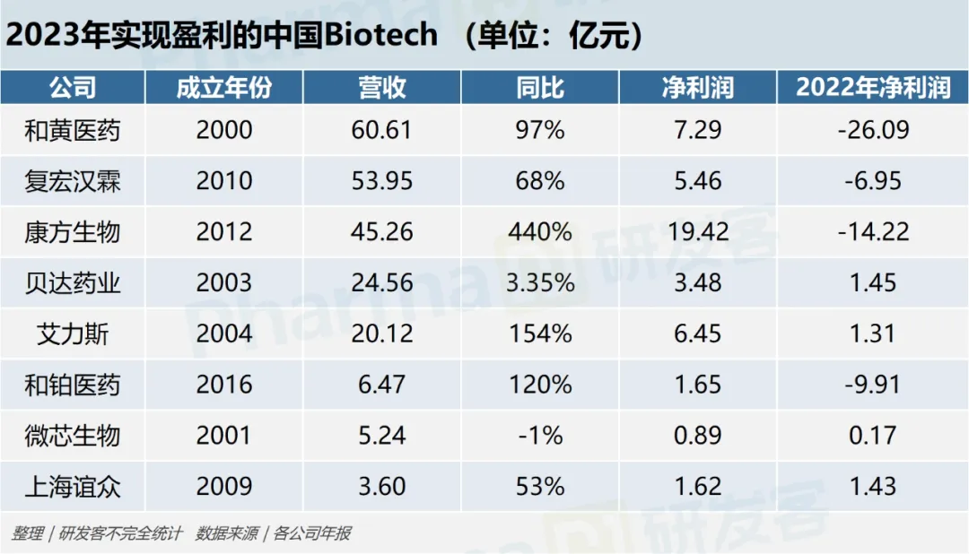 2023年,康方生物、复宏汉霖、和铂医药纷纷宣布实现自创立以来的首次年度盈利。此前,贝达药业、微芯生物、艾力斯、上海谊众等均已凭借核心产品上市扭亏为盈,并在2023年保持盈利,和黄医药则在连亏6年后首度盈利。