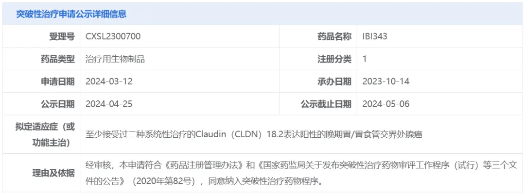 4月25日,中国国家药监局药品审评中心(CDE)官网公示,信达生物IBI343拟纳入突破性治疗品种,针对适应症为至少接受过二种系统性治疗的Claudin(CLDN)18.2表达阳性的晚期胃/胃食管交界处腺癌。根据信达生物公开资料,IBI343是一款靶向Claudin18.2的抗体偶联药物(ADC)。目前该产品正在针对Claudin18.2阳性、HER2阴性胃癌开展3期临床研究。
