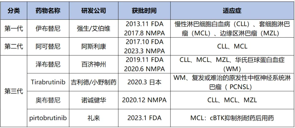从首个药物获批至今10余年,BTK抑制剂已经发展到第三代非共价抑制剂。目前已上市的6款BTK抑制剂,不可逆抑制剂包括第一代的伊布替尼,第二代的阿可替尼(阿卡替尼)、泽布替尼、Tirabrutinib和奥布替尼;可逆抑制剂包括第三代的Pirtobrutinib。