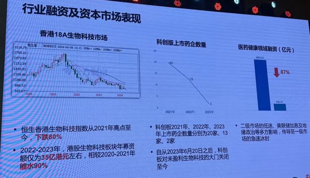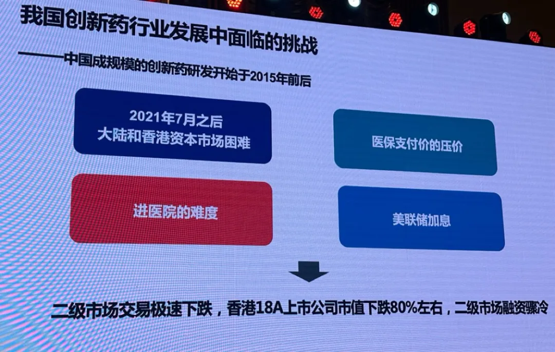 在座谈中,杨大俊博士提到,2023年仅默沙东医药一家公司的研发经费已历史性地突破了300亿美元,而我国研发强度最高的药企年研发经费刚突破100亿人民币,而且还只有一家(实际上中国所有制药企业的研发经费加起来也赶不上默沙东,甚至我国的创新药总容量,2023年可能只有200亿美元左右)。再加之我国创新药品定价,一进医保就全球最低价(其后演讲的加科思董事长兼CEO王印祥博士展示,我国创新药平均的医保定价比全球创新药低价区间中位数还要低39%);加之复杂、困难的新药医院准入壁垒,让创新药企业的融资出现了断崖式下跌,创新药企业目前挑战巨大。