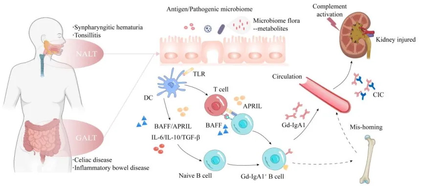 IgA肾病的发病机制复杂,涉及因素较多,目前病理生理学层面最受认可的是“多重打击”(multihit)假说,即遗传或环境因素导致Gd-IgA1(人半乳糖缺乏的IgA1)产生并积聚(hit 1)→免疫系统识别Gd-IgA1后产生相应的特异性抗体,如IgG和IgA(hit 2)→致病性肾炎免疫复合物的形成(hit 3)→肾炎免疫复合物沉积在肾小球系膜区,造成肾脏损伤,最终导致IgA肾病(hit 4)[4]。