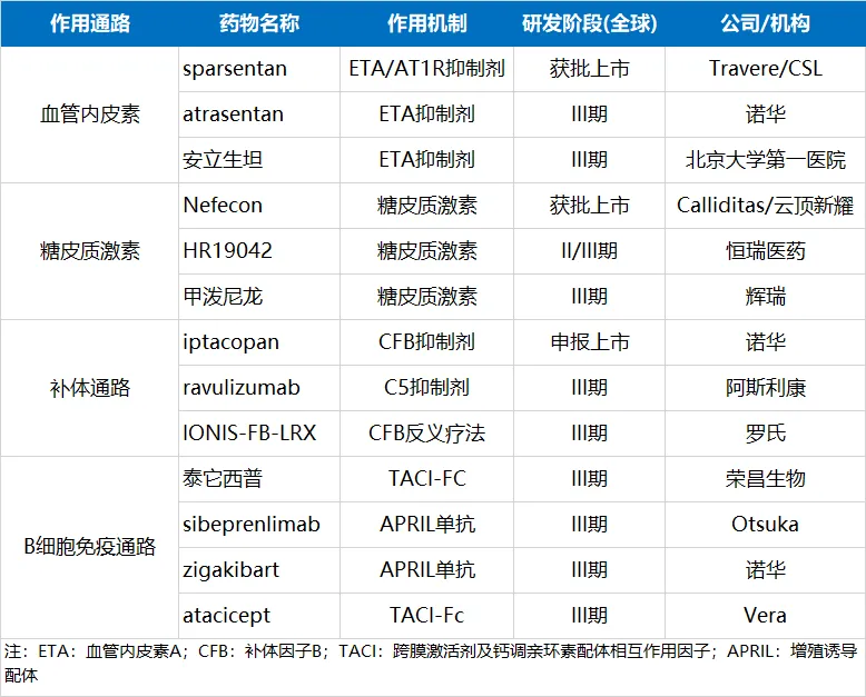 对于IgA肾病自身免疫发病机制的理解为针对不同靶点的药物研发铺平了道路,包括免疫反应、黏膜免疫、肾脏炎症和补体激活等。也正是基于此,近年来,多家制药企业基于不同的致病通路开发了多种有潜力的新型治疗药物,包括糖质激素类、靶向血管内皮素系统类、靶向B细胞免疫通路类以及靶向补体系统类新药。
