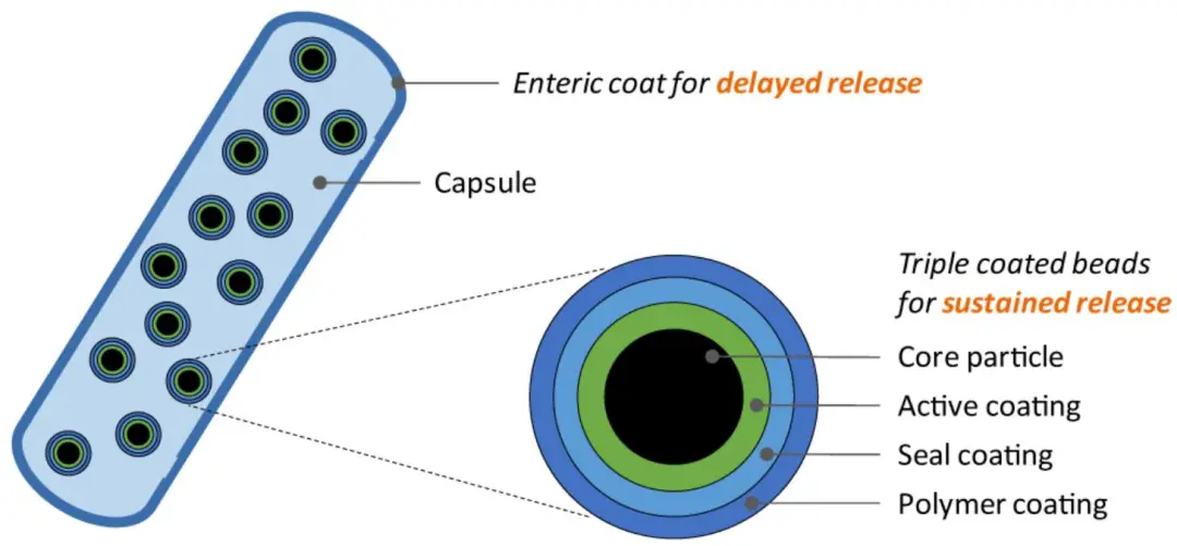 除了开发FIC新药外,通过对剂型的优化和改良,开发适合IgA肾病患者的高端复杂制剂,从而起到Me-Better效果也是一条差异化的创新选择。高端复杂制剂正逐渐成为医药研发的新焦点,这类制剂能提高药物的靶向性和稳定性,优化药代动力学特征,从而提升治疗效果并降低副作用。未来,随着技术的不断进步,高端复杂制剂有望为患者带来更安全、更有效的药物选择,推动医药行业向更高层次发展。去年底,耐赋康(Nefecon)在国内上市,成为国内首款针对IgA肾病的对因治疗药物。Nefecon采用了复杂的三层微丸包衣加上三层胶囊壳包衣工艺,以确保药物可以完整地到达回肠并在回肠持续释放,作用于回肠末端的黏膜B细胞(主要在派尔集合淋巴结),从而减少Gd-IgA1的产生,在发病机制上游阶段治疗IgA肾病,但其工艺难度和成本均相对较高。